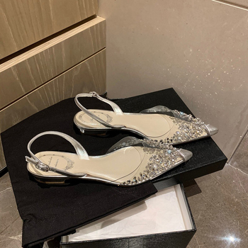 Venta al por mayor de zapatos de novia de Punta personalizada diamantes de imitación SlingBack verano Femme Wanita Sandalias de tacón bajo para mujeres y damas